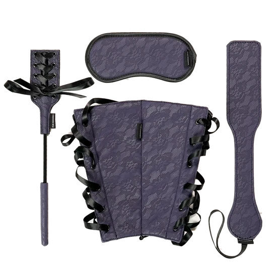 Delve into the world of kink with a luxe, four-part set featuring a blindfold, paddle, crop, and arm restraints. The paddle and crop take painful pleasure experiments to mastery, the blindfold removes sight to spotlight sensation, and the arm restraints bind for sultry submission. Satin accents and plush, lace-print material add a touch of softness to contrast the bold intensity of BDSM play.